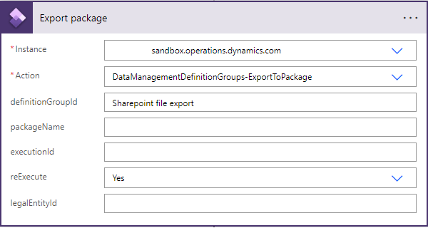 - Configure it to export the export project created in the earlier step, specifying the instance, definition group (project name), action as specified and the legal entity.