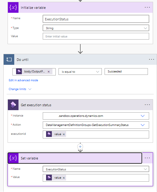 - Add Do Until action to keep looping till the status turns to succeeded.