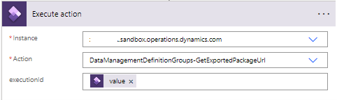 - Add actions and choose GetExportedPackageURL action and specify the execution Id.